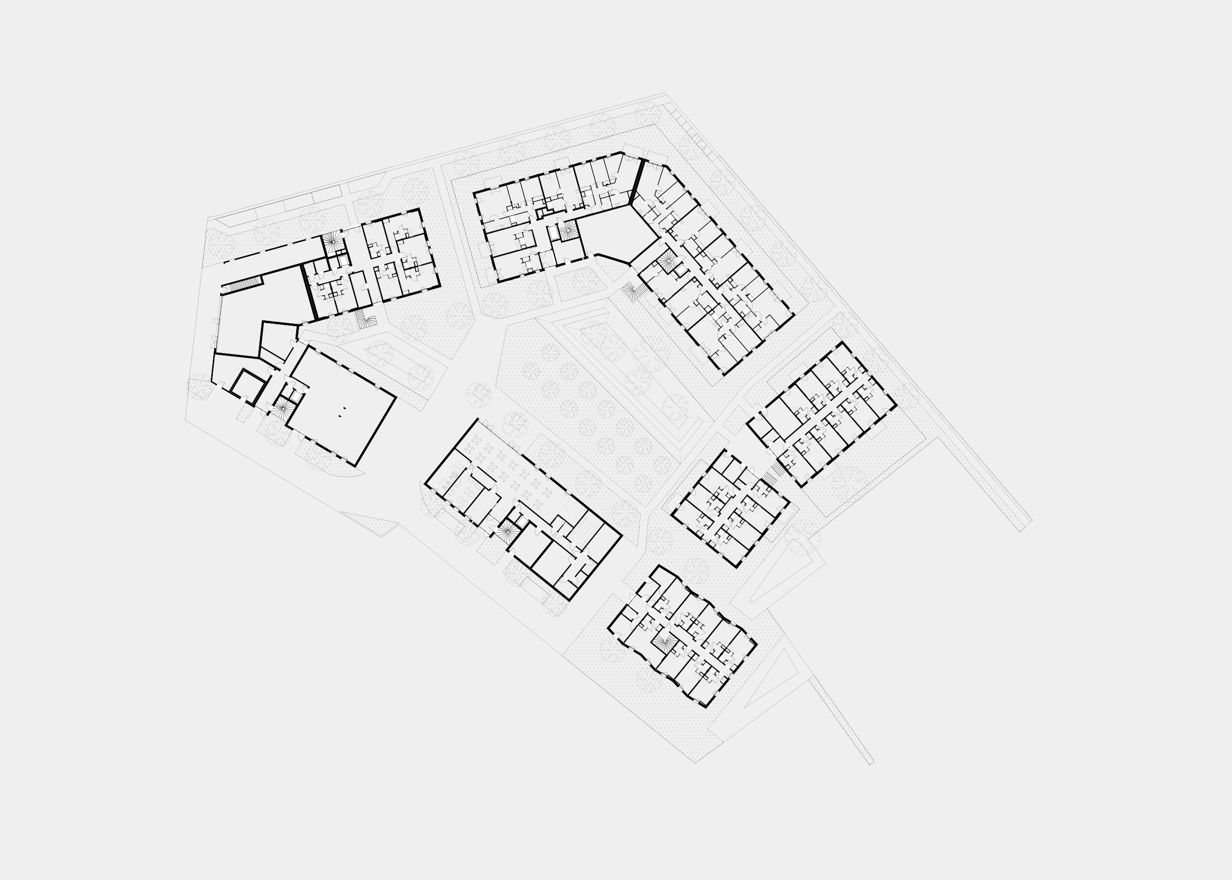 La position du tènement entre des constructions collectives hautes et du pavillonnaire impose à une volumétrie dégressive. Une partie de la résidence étudiante, les logements, les bureaux et le commerce s’implantent en un R+3+attique de manière monolithique pour marquer le front de rue. L’attique et la toiture à faible pente, couplés à une modénature de façade horizontale permettent d’allonger ces volumes. Des failles visuelles marquées par des balcons, les escaliers extérieurs ou des loggias donnent à voir sur le cœur d’îlot commun et largement paysagé. Le dernier bâtiment de la résidence étudiante et le foyer jeunes actifs proposent une architecture intermédiaire. Ces deux volumes proposent des toitures à double pan fortes et un plissement soit de la façade, soit de la double peau afin de dessiner une échelle plus domestique à ces bâtiments.