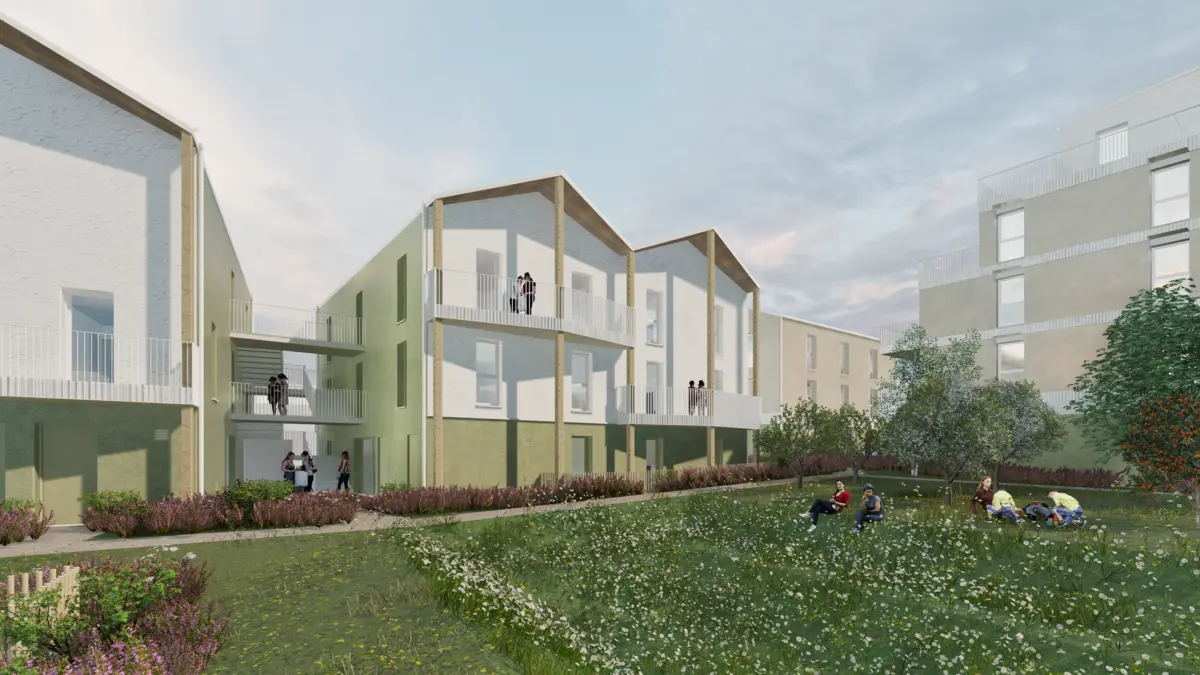En plein cœur d’un quartier pavillonnaire en densification, ce projet implante 60 logements et 111 chambres étudiants et colocations. Le projet répartit ce programme en 5 constructions organisées autour d’un espace commun partagé. Ce cœur d’îlot est pensé comme un véritable lieu de vie accueillant les accès au projet, la terrasse partagée et le verger commun. Aucune clôture n’entrave cet espace permettant au projet de connecter les différentes rues entre elles par des cheminements.